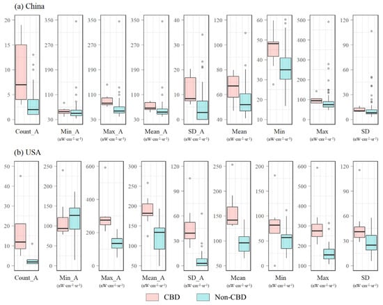 The boxplots of nine indexes are based on PAAs of CBD and Non-CBD. (a,b) The boxplots of China and the USA.