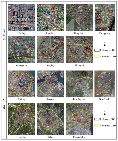 As shown in Figure 8, the yellow polygons were produced by the localized contour tree method and our rules, the red polygon were urban CBD boundaries in the auxiliary data. The shapes of computed CBD were determined by the contours of its NTL intensity surface. As can be seen from Figure 8, all computed CBDs captured the corresponding positions of the reference CBD. And through the indices of location validation (Table 6), the precision or recall of every study city was more than 0.6, which indicated that our method could validly recognize and delimitate CBDs in space. Regarding the evaluation of boundary, it can be seen that F1-score of several cities near or greater than 0.5, which displayed a good agreement between reference CBD and computed boundaries. Few cities’ F1-score were below 0.5(i.e., Shanghai, Boston, Los Angeles, Houston, and Dallas), and relevant Jaccard indexes are small because these computed CBDs all completely enclose the reference CBD in space.