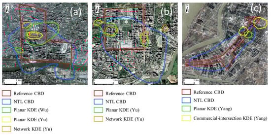 The comparison of CBDs from the proposed new method (NTL CBD) and GIS-based methods. (a) Guangzhou; (b) Shenzhen; (c) Nanjing.
