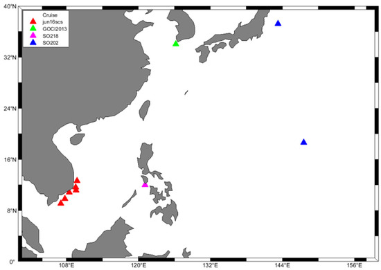 In order to verify the applicability of satellite products in the South China Sea, this paper uses the HPLC measured data of four cruises in the SEABASS database (https://seabass.gsfc.nasa.gov/, accessed on 24 December 2022) for verification. Finally, 10 coincident satellite data and HPLC data were selected at near-surface depths (<10 m) using the nearest method, as show in Figure 1. The time range includes 2009, 2011, 2013, and 2016.