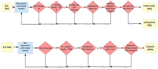The identification method of mode-water eddies is as follows. Studies on mode-water eddies show that compared with anticyclonic eddies, mode-water eddies have a similar shape to the anticyclonic eddies at the SLA. However, the mode-water eddies have negative temperature anomalies and negative salinity anomalies at the center [25,37]. Therefore, this paper makes a simple modification based on Chelton’s method to identify mode-water eddies: if the temperature and salinity anomaly at the center of the anticyclonic eddy is less than 0, then this anticyclonic eddy is regarded as a mode-water eddy. The flowchart of the identification method of mesoscale eddies is shown in Figure 2.