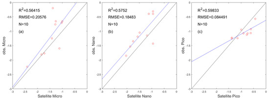Scatter plots of in−situ versus satellite data: (a) micro, (b) nano, and (c) pico. The solid line is the trendline, and the dotted line is the 1:1 line. The N is the number of samples.