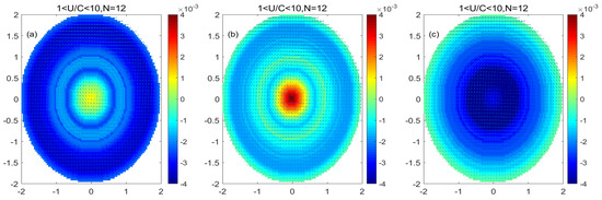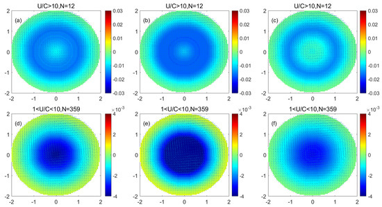 Figure 14d,e shows the anomalous distribution of the quasi-geostrophic vertical velocity of the cyclonic eddy. As the depth increases from 0 m to 150 m, the vertical upward velocity at the eddy’s center gradually increases, and the vertical upward velocity decreases after 150 m to 200 m. At the periphery of the eddy, the vertical velocity of the eddy increases gradually downward from 0 m to 125 m and slowly decreases between 125 m and 250 m. The average vertical upward velocity anomaly at the center of the eddy is much larger than the average vertical upward velocity anomaly at the periphery of the eddy. This shows that in the cyclonic eddy, the seasonal pycnocline of the eddy and the main pycnocline in the subsurface of the eddy are uplifted due to the vertical action in the eddy. The vertical velocity anomaly changes in the high nonlinear cyclonic eddy are similar to those in the low nonlinear cyclonic eddy in structure and more significant than those in the low nonlinear cyclonic eddy.