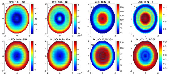 Figure 14b,c shows the anomalous distribution of the quasi-geostrophic vertical velocity of the anticyclonic eddy. As the depth increases from 0 to 125 m, the vertical downward velocity at the center of the low nonlinear anticyclonic eddy gradually increases, while at 0–75 m, the vertical downward velocity at the center of the high nonlinear anticyclonic eddy gradually increases. The vertical downward velocity decreases from 125 m to 150 m in the low nonlinear anticyclonic eddy, while the vertical downward velocity in the center of the high nonlinear anticyclonic eddy slowly decreases from 75 m to 150 m. At the periphery of the eddy, the vertical velocity of the eddy will gradually increase from 0 to 125 m and slowly decrease between 125 and 150 m. This shows that in the anticyclonic eddy, the seasonal pycnocline and the main pycnocline in the subsurface of the eddy is compressed due to the vertical action in the eddy. The distribution of quasi-geostrophic vertical velocity anomalies in low nonlinear anticyclonic eddies and high nonlinear anticyclonic eddies is similar. The vertical velocity anomalies in high nonlinear anticyclonic eddies are greater than those in low nonlinear anticyclonic eddies.
