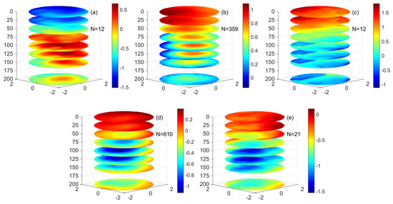 The three−dimensional structure of salinity anomalies of the different eddies. (a–e) are (a) mode-water eddies, (b) low nonlinear anticyclonic eddies, (c) high nonlinear anticyclonic eddies, (d) low nonlinear cyclonic eddies, and (e) high nonlinear cyclonic eddies. (Unit: PSU).