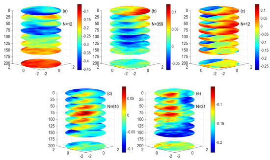 The three−dimensional monopole structure of ageostrophic vertical velocity and anomalies of the different eddies. (a–e) are (a) mode−water eddies, (b) low nonlinear anticyclonic eddies, (c) high nonlinear anticyclonic eddies, (d) low nonlinear cyclonic eddies, and (e) high nonlinear cyclonic eddies. (Unit: m/d).