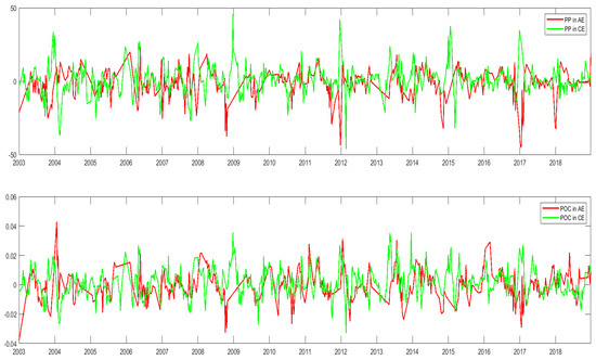 Anomalous time series of PP and POC in the center of anticyclonic eddies (AEs) and cyclonic eddies (CEs) in the NSCS (unit: mg/m3).