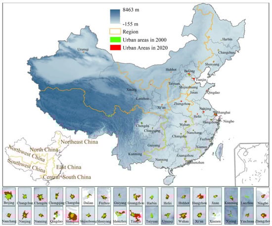 The spatial distribution of 34 municipal cities and 6 regions in China. Panels at the bottom show the urban areas of each city in 2000 (green) and 2020 (red), all at the same scale.