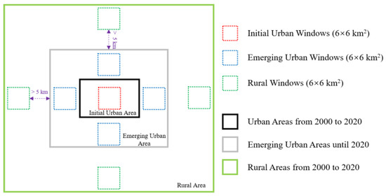 Nine research windows, each with a size of 6 km × 6 km, were selected for each city, including one initial urban window, four emerging urban windows, and four rural windows. Figure 2 shows the spatial distribution of these nine windows. Initial urban windows remained urban and developed during 2000–2020. For most cities, four emerging urban windows were selected in their main expansion directions. However, for individual cities (e.g., Lanzhou), due to their small outward expansion areas, emerging urban windows were selected in urban fringe areas. Emerging urban windows were mainly covered by undeveloped surfaces before 2000 but were gradually replaced by urban built-up areas as cities expanded from 2000 to 2020. Rural windows represent areas that remained undeveloped during 2000–2020. They were located 5 km away from urban areas to ensure that these windows were not or were weakly affected by the [41]. In each window, water bodies were excluded, and their elevation differences were within 200 m based on digital elevation model data.
