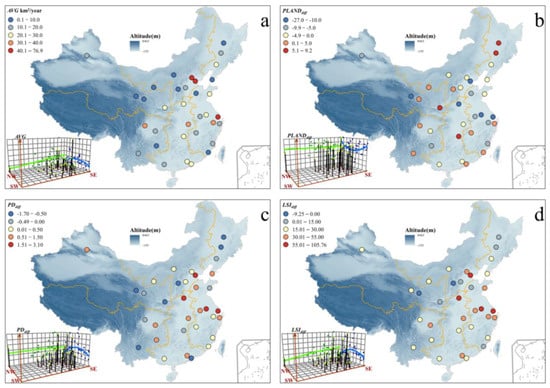 Spatial distributions of (a) the annual average expansion speed of built-up areas (), (b) the difference in the proportion of built-up areas (), (c) the difference in the built-up patch density (), and (d) the difference in the shape index of built-up areas () in 34 cities between 2020 and 2000. Inset plots show results from the global spatial trend analysis, where the green and blue lines are fitting trend lines along the east-west and north-south directions, respectively.