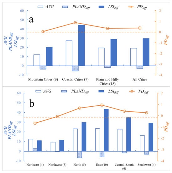 Figure 4a shows clear regional and topographic differences in . The of coastal cities was the most significant and fastest, as indicated by clear decreases in proportion, density, and shape regularity of built-up areas. Due to topographical limitations, the of mountain cities was the least significant and the slowest, with changes in and also the smallest. Figure 4b shows in different regions. differences were consistent with differences in economic level. The of cities in eastern, northern, and central-south China, areas with developed economies, were the fastest. The of cities in northeast and northwest China, areas with slow-growth economies, were the slowest. The proportions, densities, and shape regularities of built-up areas decreased more markedly in cities with faster . For cities with slower , the proportions and densities of the built-up area increased or little changed (e.g., in the northeast and northwest China), and their shape regularities changed little.