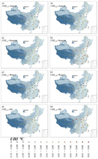 SDs in and were significant. Summertime and values were positive in all regions, but in the winter, they were negative in northwest and northern China and positive elsewhere (Figure 5(a2,a3,b2,b3) and Figure 6b). Moreover, summertime and values were more intense than in winter during the day, and the SDs of were larger than those of (Figure 5(a2–a4,b2–b4)). There are two reasons for this. First, urban spatial morphology was significantly correlated with LST in summer but not in winter [59,60]. Second, the evaporative cooling effect caused by rural vegetation was stronger in summer than in winter [39,48,61]. The SDs of in the 34 cities were all positive, and the SDs of in most cities were also positive, except in Urumqi and Lanzhou. This might be because the SDs in vegetation in the rural areas of these two cities are small [62]. Overall, the SD in was significantly larger than that of (Figure 5(a4,b4)).