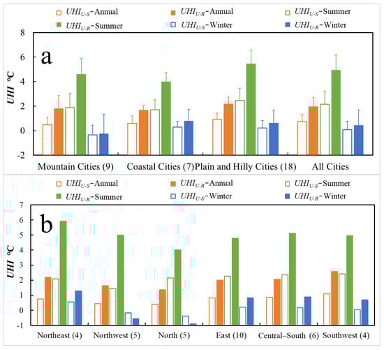 Topography, land-cover type, and meteorological conditions can affect the urban , altering the [43,63]. Figure 6a shows and for different topographies. Annual and summertime show similar patterns: the of coastal cities was smaller than that of inland cities because sea breezes driving cold air into urban areas greatly reduced the in summer [64,65]. However, in winter, the of coastal cities was larger than that of inland cities, probably because land breezes weakening circulation reduced the heat exchange between urban and rural areas, thus increasing the . This needs further study.