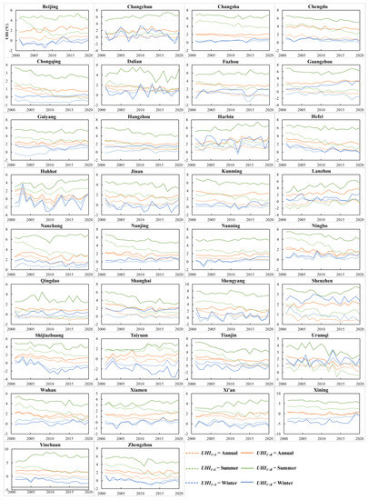 Temporal variations (annual, summertime, and wintertime) in and in 34 cities from 2001 to 2020. The solid and dashed lines represent and , respectively. Red, green, and blue colors represent annual, summertime, and wintertime results, respectively.