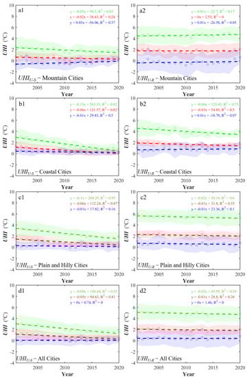 and variations from 2001 to 2020 in mountain cities (a1,a2), coastal cities (b1,b2), plain and hilly cities (c1,c2), and all cities (d1,d2). Panel numbers 1 and 2 after the panel letters represent and , respectively. Red, green, and blue colors represent annual, summertime, and wintertime results, respectively.