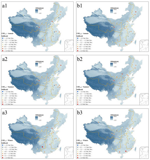 Table 1 gives annual, summertime, and wintertime OLS results (i.e., coefficients of each and ). Figure 9 shows StdResids outputs from the OLS model. The correlation between the s and SloFLs of (including and ) was stronger in summer than in winter, illustrated by the highest value that passed the significance test (Table 1) and absolute values of StdResids in all cities less than 2.5 (Figure 9(a2,b2)) in summer. This suggests that significantly affected the variation in in summer but not in winter, consistent with results in Section 3.3. Results from the spatial autocorrelation test in Table 1 show that StdResid patterns were not significantly different from random in summer (i.e., Moran’s I was close to 0, and the Z-score was between −1.65 and 1.65), further suggesting that the OLS results are reliable, and that the analysis did not neglect any key explanatory variables.