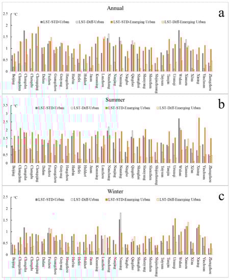 LST-STDs and LST-Diffs of the 34 cities: (a) annual, (b) summertime, and (c) wintertime. LST-STD is defined as the standard deviation of LST for the whole urban area or emerging urban areas shown in Figure 1. LST-Diff is defined as the absolute value of the difference between the average LST of the selected urban window (or emerging urban windows) and the average LST of the whole urban areas (or emerging urban areas).