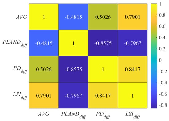 Figure 11 shows the correlation coefficient matrix of the four s. There was a significant correlation between and , i.e., the increase in proportion corresponded to the increase in density of the built-up lands. There was a positive correlation between and and a negative correlation between and , indicating that the of a city with larger was primarily through sprawling, which rapidly increased the built-up areas in emerging urban areas but reduced the overall proportion and density of built-up areas. This results in changing little or even decreasing but rapidly increasing, ultimately accelerating the decreases in and in summer. However, for a city with a smaller , its expansion is mainly achieved by infilling, increasing the proportion and density of built-up areas in the initial urban area with a slow sprawling speed. This increases but slows the increase in , eventually attenuating the reduction in and . is thus positively correlated with the decreasing rate of . There were positive correlations between and , and and , but a negative correlation between and , meaning that for a city with built-up areas increasingly complex in shape, its proportion and density of built-up areas commensurately decreased and vice versa. The increasingly complex shapes of built-up areas thus accelerated the reduction in .