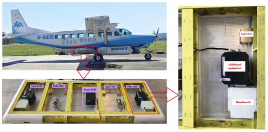 The flight experimental setup includes the airplane, the self-designed array POS system, which includes an array POS computer system (DPCS), GNSS, a main IMU and six sub IMUs and the base station. The parameters of each sub IMU are listed in Table 1. Figure 3 shows the main flight experimental setup. The GNSS antenna is installed on the top of the aircraft, and the base station with GNSS station and receiver is located in the open place where it can timely receive the position and attitude signal of the airplane. The array POS is installed in the wing box under the belly. The wing box adopts a double cantilever beam structure, which is designed according to the deformation law of the airplane wing in the air. It is notable that the lever arm between main IMU and sub IMU is measured by the laser total station instrument before the experiment is carried out. The whole flight path is shown in Figure 4.