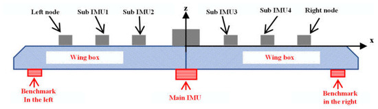 In actual flight, due to the limitation of the number of antennas, only the left node and the right node are equipped with dual antennas. For the convenience of description, the installation diagram of the array POS is simplified as Figure 5, and the following processing is illustrated with the left node and the right node. The data from a 2-min stable flight phase are selected for the semi physical simulation verification experiment. The simulation parameter settings of each sub-IMU are shown in Table 2.