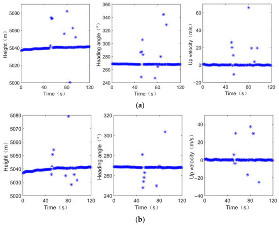 As shown in Figure 6, the height, up-velocity and heading angle data output from dual antennas are superimposed with five isolated random outliers and five continuous outliers. The isolated random outliers are superimposed when time is 50 s and the continuous outliers are 75 s. The mean value of continuous outliers is 5, and the variance is 10, while the interval of the isolated outlier is 5 s. The processed data of GNSS in the left node and right node are shown in Figure 6a,b, respectively.