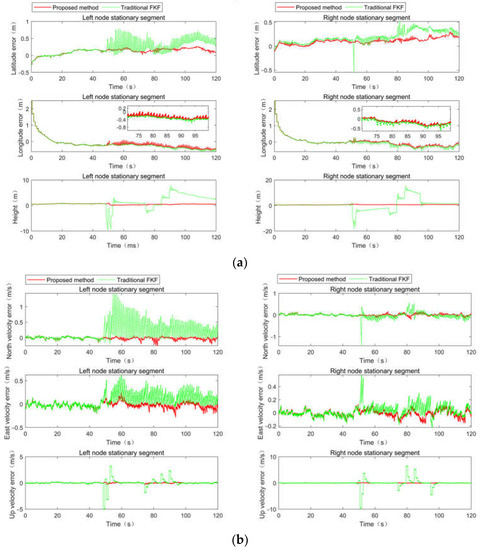 The comparison result between the proposed method and the traditional method of position, velocity and attitude are shown in Figure 7. It is noted that the traditional FKF in this section is the traditional federated Kalman filtering algorithm. Figure 7a shows the position errors. It can be seen in the figure that the maximum latitude error, longitude error and altitude error of the left node calculated by traditional KFK are 0.78 m, 1.19 m and −9.15 m, respectively, while those of the left node calculated by the proposed method are 0.23 m, 1.18 m, 1.21 m, respectively. The maximum latitude error, longitude error and altitude error of the right node calculated by traditional KFK are −0.56 m, 1.23 m and −17.76 m, respectively, while those of the right node calculated by the proposed method are 0.22 m, 1.23 m and 1.11 m, respectively. The latitude and height are both greatly improved by the proposed method in both the left node and the right node when there are abnormal values in the measurement information. In Figure 7b, the maximum north velocity errors of the left node and the right node calculated by traditional KFK are 1.40 m/s and 0.26 m/s, while those calculated by the proposed method are −1.39 m/s and −0.22 m/s, respectively. The maximum east velocity errors of the left node and the right node calculated by traditional KFK are 0.62 m/s and 0.57 m/s, while those calculated by the proposed method are −0.27 m/s and −0.16 m/s, respectively. The maximum up velocity errors of the left node and the right node calculated by traditional KFK are −4.98 m/s and −9.46 m/s, while those calculated by the proposed method are 0.32 m/s and −0.09 m/s, respectively. That is, the north velocity, east velocity and the up velocity of the left node and the right node all fluctuate greatly when outliers appear. In Figure 7c, the maximum heading angle errors of the left node and the right node calculated by traditional KFK are −2.61° and −2.65°, while those calculated by the proposed method are 0.26° and −0.37°, respectively. The maximum pitch angle errors of the left node and the right node calculated by traditional KFK are −0.96° and −1.23°, while those calculated by the proposed method are −0.32° and −0.25°, respectively. The maximum roll angle errors of the left node and the right node calculated by traditional KFK are −3.88° and 4.23°, while those calculated by the proposed method are −0.16° and −0.23°, respectively. Namely, all the attitude angles are affected by abnormal values, and the proposed method effectively eliminates the influence of abnormal values in both the left node and the right node.
