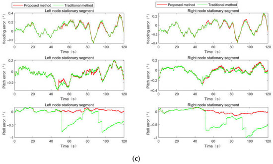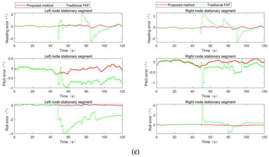 The comparison result between the proposed method and the traditional method of position, velocity and attitude are shown in Figure 9. It is noted that the traditional method in this section is the fault-tolerant federated combination method based on innovation characteristics. In Figure 9a, the maximum latitude error, longitude error and altitude error of the left node calculated by the traditional method are −12.91 m, 1.22 m and 0.89 m, respectively, while those calculated by the proposed method are 3.62 m, 1.21 m and 0.89 m, respectively. The maximum latitude error, longitude error and altitude error of the right node calculated by the traditional method are −14.08 m, 1.26 m and 0.81 m, respectively, while those calculated by the proposed method are 1.16 m, 1.26 m and 0.79 m, respectively. The latitude is most affected by abnormal values, and the accuracy is greatly improved by the proposed method in both the left node and the right node, which matches the previous analysis. In Figure 9b, the maximum north velocity error, east velocity error and up velocity error of the left node calculated by the traditional method are −5.20 m/s, 0.22 m/s and 0.28 m/s, respectively, while those calculated by the proposed method are 0.12 m/s, 0.22 m and 0.28 m, respectively. The maximum north velocity error, east velocity error and up velocity error of the right node calculated by the traditional method are −5.18 m/s, −0.27 m/s and −0.18 m/s, respectively, while those calculated by the proposed method are 0.10 m/s, 0.13 m and −0.18 m, respectively. The north velocity of the left node and the right node fluctuate greatly, and the east and up velocity are relatively stable when an abnormal value appears, which also matches the previous analysis. In Figure 9c, the maximum heading angle error of the left node and the right node calculated by the traditional method are −0.26° and −0.38°, and those calculated by the proposed method are also −0.26° and −0.38°, respectively. The maximum pitch angle error of the left node and the right node calculated by the traditional method are −0.82° and −0.93°, and those calculated by the proposed method are 0.81° and −0.81°, respectively. The maximum roll angle error of the left node and the right node calculated by the traditional method are −0.77° and −0.99°, and those calculated by the proposed method are 0.14° and −0.15°, respectively. Compared with heading and pitch angle, roll angle is more affected by abnormal values, and the proposed method effectively eliminates the influence of abnormal values both in the left node and the right node.