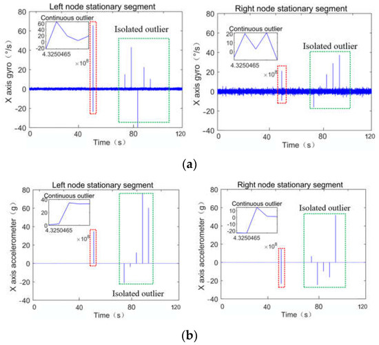 Data from the IMU after adding outliers. (a) Data from the gyro in the x-axis direction after adding outliers; (b) data from the accelerometer in the x-axis direction after adding outliers.