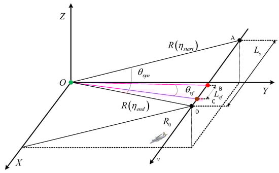 The ViSAR system operating in staring spotlight-mode can illuminate the same area continuously using beam steering. It is not limited by the beam width, so it can achieve higher azimuth resolution and longer video observation times. Figure 1 shows the data acquisition geometry of staring spotlight-mode ViSAR. In this figure, the SAR sensor travels along the x-axis at an effective velocity v. is the closest range from the center of scene O to the trajectory. is the instantaneous slant range and and are the starting and ending times of the recording, respectively. is the relative rotation angle between and . The length of is the full synthetic aperture length and is the sub-aperture length (where ) corresponding to a video frame. The value of depends on the desired azimuth resolution of a video frame. Assuming that is the coherent integration angle corresponding to a video frame, then it can be expressed as []: