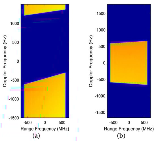 Therefore, after azimuth resampling the 2−D spectrum is sampled uniformly and is equivalent to the spectrum of the broadside mode, as shown in Figure 2. The corresponding simulation parameters are listed in Table 1. Comparing Figure 2a,b, the signal spectrum after azimuth resampling is equivalent to the broadside SAR. At the same time, the effective velocity v is transformed into .