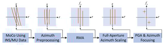 Then, through the modified full-aperture azimuth scaling processing, the traditional PGA [] can be used to estimate the residual phase error and the specific motion compensation process is shown in Figure 4.