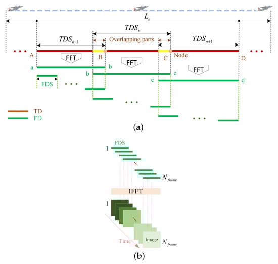 Correspondence between TDS and FDS (a). TD means ‘time domain’; FD means ‘frequency domain’. , and correspond to those in Figure 5, respectively. A schematic diagram of the formation of multiple video frames (b) and represents the total number of FDSs.