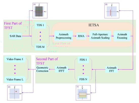 The complete flow diagram of high-resolution ViSAR data processing is shown in Figure 8 and it consists of two main steps: TDS processing, which corresponds to the first part of TFST and FDS processing, which corresponds to the second part of TFST. In (A), the areas marked by red, green and blue boxes, respectively, illustrate the division of TDS in a two-dimensional time domain, which corresponds to Figure 5. Next, M TDSs can be processed by IETSA in parallel and the output is shown in (B). Corresponding to (A), (C) shows the division of N FDSs. Moreover, a geometric correction is applied to remove the distortion introduced by azimuth resampling []. The final output is shown in (D); thus, a series of video frames for generating video are obtained.