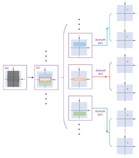 Time frequency diagram of generating multiple video frames. The different directions of the point targets in the image domain in the last column represent different observation times. Geometric correction is performed by default after azimuth IFFT. In particular, (A) and (C) correspond to those in Figure 8, respectively.