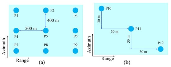 Different from IETSA simulation, for the verification of TSFT, we designed a scene with three-point targets, as shown in Figure 10b, which includes two stationary point targets P10 and P11 and and a moving target P12 whose azimuth and range speeds are −0.4 m/s and −0.1 m/s, respectively. The parameters used for TFST verification are shown in Table 3.