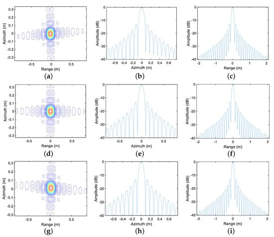 Contour plots (first column), azimuth (second column) and range profiles (third column) of the impulse response function for the three point targets P1 (a–c), P5 (d–f) and P9 (g–i).