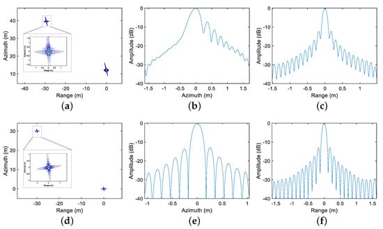 Contour plots (first column) for the two point targets P10 and P11. Azimuth (second column) and range profiles (third column) of the impulse response function for the point target P10. (a–c) and (d–f) are the simulation results of ETSA and IETSA, respectively.