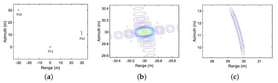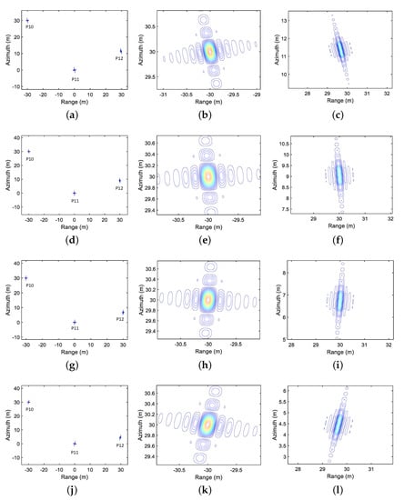 The simulation results of TFST are shown in Figure 13 and Figure 13a is frame 49, with a squint angle of 10.17°, Figure 13b is frame 148, with a squint angle of 3.25°, Figure 13c is frame 246, with a squint angle of −3.69° and Figure 13d is frame 344, with a squint angle of −10.40°. The first column is the result for the entire scene, while the second and third columns are the enlarged results of P10 and P12 from the first column, respectively.