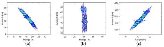 In addition, a distributed target (DT) with a size of m is simulated, whose velocities in azimuth and range are −8 m/s and −1 m/s, respectively. The simulation results of DT are shown in Figure 15. The time interval between Figure 15a,b is about 15 s and that between Figure 15b,c is about 19 s. According to Figure 15, it can be seen that the azimuth and range position of DT both change with time and the imaging result is seriously defocused. Compared with Figure 13, the defocus and displacement of the moving target in Figure 15 are larger because of its greater velocity. Simulation of DT reveals how moving targets appear in real scenes.
