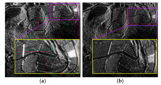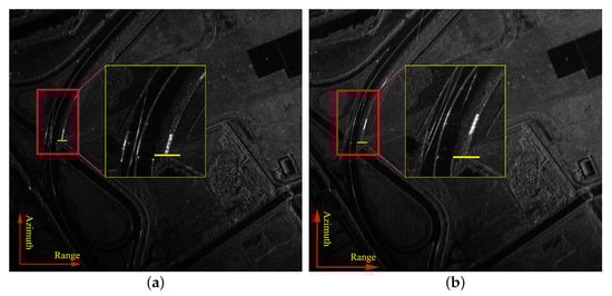 Comparison of data processing results of ETSA (a) and IETSA (b). Similar to the point target simulation, the squint angle and coherent integration angle of the experimental data are 7.2° and 5°, respectively.