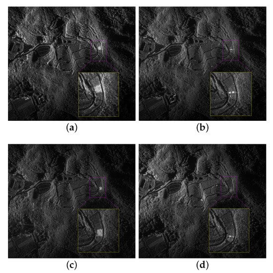 The processing results of TFST are shown in Figure 19 and Figure 20. Figure 19 shows video frames at four different times of the area in Figure 16, from which it can be inferred that the aircraft is moving from bottom to top along the azimuth. The result shows that ViSAR can acquire images from multiple angles of the same target, which is helpful for image information interpretation. Moreover, Figure 20 is an urban scene and there is a road on the left. Comparing Figure 20a and Figure 20b, it is evident that the bright line in the area marked by the red rectangle is a moving target. Its position has shifted and the imaging result is seriously defocused. This is consistent with the simulation results of DT in Figure 15. In addition, the background of the ViSAR image is static and the position of the stationary target is constant, so the target whose position changes significantly in different video frame images should be a dynamic target. This result demonstrates the potential of ViSAR for moving target indication (MTI).