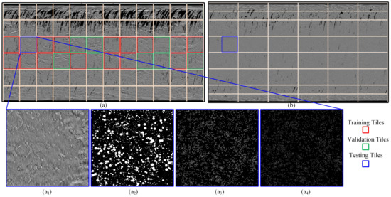 For the global THEMIS 2010 mosaic images in Figure 5b, the same areas between 30 degrees north and south latitude toward the equator are divided into 12 individual tiles of the same size, from which each individual tile spans 60 of longitude and 30 of latitude. Considering the resolution of THEMIS 2010 is 99 m, the size of each individual tile is 35,565 × 17,783 pixels.