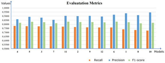 -score takes both false positives and false negatives into account. It is the weighted average of the precision and recall and is defined by Equation (10):