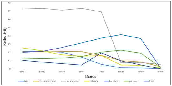 The characteristics of the water body reflected in each segment of the electromagnetic wave spectrum form the basis of water-body extraction from remote sensing images []. Researching spectral characteristic curves not only helps us to analysis the spectral reflection law of water body and other surface feature types, but also helps us to find the band combination with maximum spectral reflection difference between a water body and other surface objects. In this study, a certain number of sample points were randomly collected from lakes, rivers, wetlands, ice and snow, mountain shadows, bare lands, grasslands, forests, and other typical features on the Tibetan Plateau. The spectral reflectance values of the sample points in Band1–Band7 and Band9 were counted one by one, mean values of various ground objects in Band1–Band7 and Band9 were calculated, and spectral characteristic curves of typical features on the Tibetan Plateau were drawn (Figure 3).