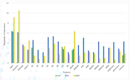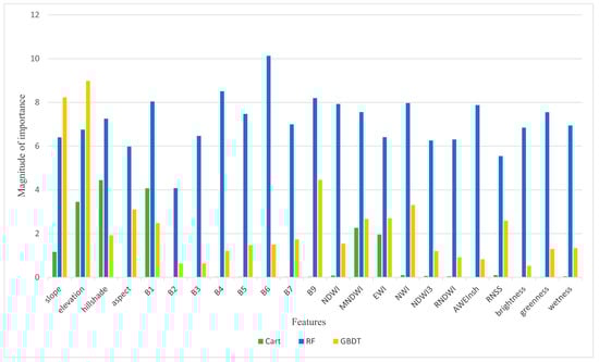 Based on the 23 spectral and topographic features we constructed, together with the feature importance analysis method provided by the GEE cloud platform, this study calculated the importance scores of the 23 feature vectors in the Cart, RF, and GBDT classification algorithms of the 2016 and 2021 lake extraction (Figure 4 and Figure 5). The scores were used to indicate the magnitude of importance. The greater the importance, the higher the score. The importance values were standardized.