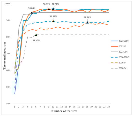 The features were sorted according to their importance scores, and the features with higher importance scores were individually selected in the GEE for classification. It was found that the RNSS lake extraction index constructed by band combination was of higher importance in both the Cart and GBDT classification methods. In this study, the top n (n∈[1, 23]) features with the highest importance scores in 2016 and 2021 were selected for classification, and the classification accuracy was individually calculated (Figure 6).