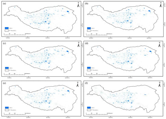 The distribution of lakes on the Tibetan Plateau extracted by different classification methods and characteristic indexes: (a) GBDT extraction maps in 2021, (b) RF extraction maps in 2021, (c) Cart extraction maps in 2021, (d) GBDT extraction maps in 2016, (e) RF extraction maps in 2016, and (f) Cart extraction maps in 2016.