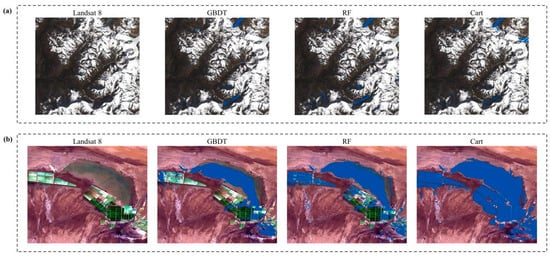 Figure 8 shows the detailed regional extraction results of the three classification methods under the influence of mountain shadow and snow cover (Figure 8a) and under the influence of similar features such as alluvium and shoals (Figure 8b). The base map of the regional detail was synthesized by the four, three, and two bands of the Landsat 8 OLI image, and lake water area extracted by the three classification methods is shown in blue. As can be seen from Figure 8a, the three classification methods mistakenly extract some mountain shadows into lakes; among them, the RF method has the most mistakenly extracted areas, followed by the GBDT and Cart methods. All three classification methods can extract the lakes covered with ice and snow, among which the GBDT classification method has the smallest extraction area. The RF classification method takes the second place. The Cart classification method has the largest extraction area; but it also mistakenly extracts a large range of ice and snow into lakes. As shown in Figure 8b, the boundary of the natural lake (East Dabusun Salt Lake) is located at the upper-right of the image, and the lower edge of the lake is adjacent to similar saline-alkali beaches or pond-like artificial features, which could not be classified as lakes when classifying the features. Therefore, it was selected as the river and wetland type in this study. Nevertheless, the three classification methods still had different degrees of misextraction. The range of lakes extracted by the GBDT classification method was the smallest and closest to the actual lake boundary range. The range of lakes mistakenly extracted by the RF classification method was larger; however, that extracted by the Cart classification method was the largest. In summary, although the area of lake water extracted by the GBDT classification method was small, the extraction accuracy was the highest. The real lake pixels accounted for a higher proportion of the pixels identified as lakes by the classifier and had higher user’s accuracy and overall accuracy.