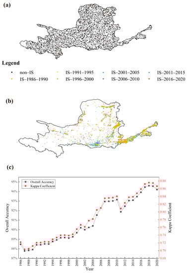 Validation points of (a) non-impervious surfaces (IS) and (b) IS areas; (c) overall accuracy and kappa coefficient of IS-Yellow River Basin mapping based on validation samples.