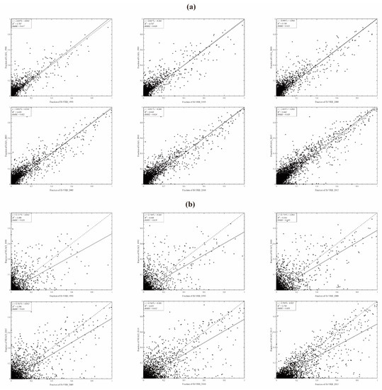 Validation samples used to calculate quantitative metrics are usually used to analyze the accuracy of results, which can be referred to as “pixel-based”. Overall accuracy (OA) and kappa coefficient were selected for assessing the mapping results of impervious surfaces in the Yellow River Basin. The validation dataset had 214,000 points, including 4600 non-IS points and 2400 IS points (updated every five years) (Figure 2a,b). Evaluating the consistency and fit between the IS-YRB and existing products is also a method for assessing accuracy [20], which can be referred to as “fraction-based”. Specifically, all images were resampled to a resolution of 0.05° × 0.05°, and regional statistics were then performed to obtain the fraction of IS areas. The root mean square error (RMSE) and coefficient of determination (R2) were taken as judgment indicators to map scatterplots of the linear regression between different products.
